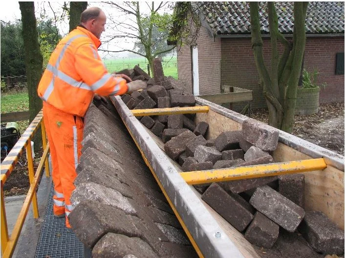 Dutch Company Vanku VB has developed a semi-automatic vertical brick and paver laying machine, called Tiger-Stone, that keeps your workers off their hands and knees and increases their productivity. With machine width options of 13’, 16’, and 20’, the company claims that with this machine, a 2 person crew can lay at least 3,230 SF of pavers per day. It’s estimated that the conventional method of brick paving only produces 800 to 1075 square feet per day.