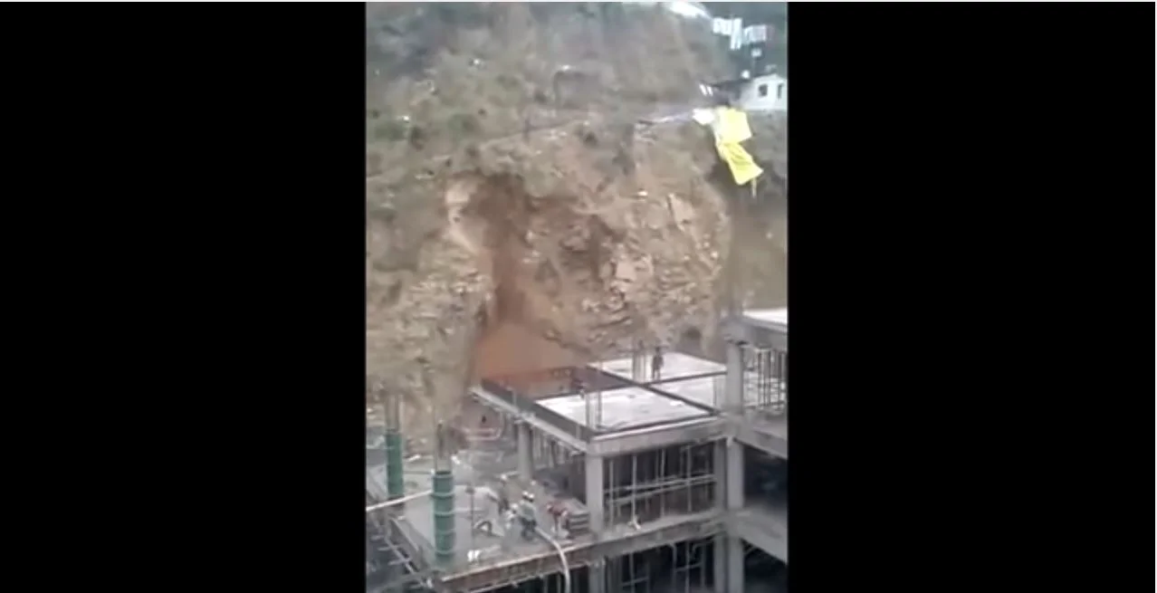 Dramatic footage of a landslide that hit a construction site in Himachal Pradesh, India was caught on video and recently shared on Youtube. In it, you can see small chucks of earth start to fall off the adjacent cliff, which very quickly increase in size, causing panic in the workers. It’s unclear if anyone was injured in the incident, but we certainly hope everyone was able to escape.