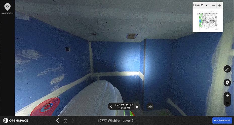 OpenSpace not only charts your path around the jobsite, dropping checkpoints directly onto a digital floor plan, but also allows you to review pictures of the same area from different times. One of the coolest features that I’ve seen so far is the split screen option, which shows the same view side-by-side at different points throughout history, shown in the picture below. This will make it much easier to determine exactly what is behind walls after the drywall goes up.