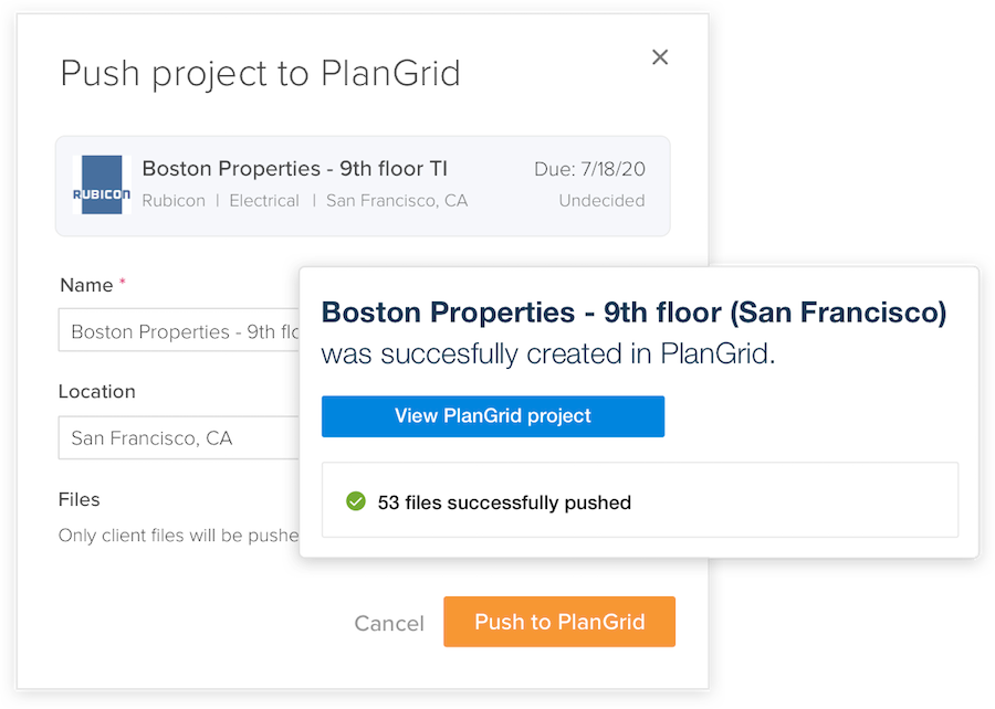 BuildingConnected will now feature a “push to PlanGrid” button, allowing PMs to create PlanGrid projects and all of the pre-construction project files will be immediately available to the field staff.